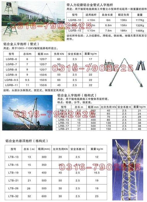 特点:1、杆体采用国标铝合金管,重量轻,承载能力强。2、组装、拆卸方便,利用采用三角型稳定性,不用打地锚,即可轻松立杆。3、采用快、慢双速手摇绞磨,结合双滑轮组,单人摇动绞磨即可完成立杆工作。