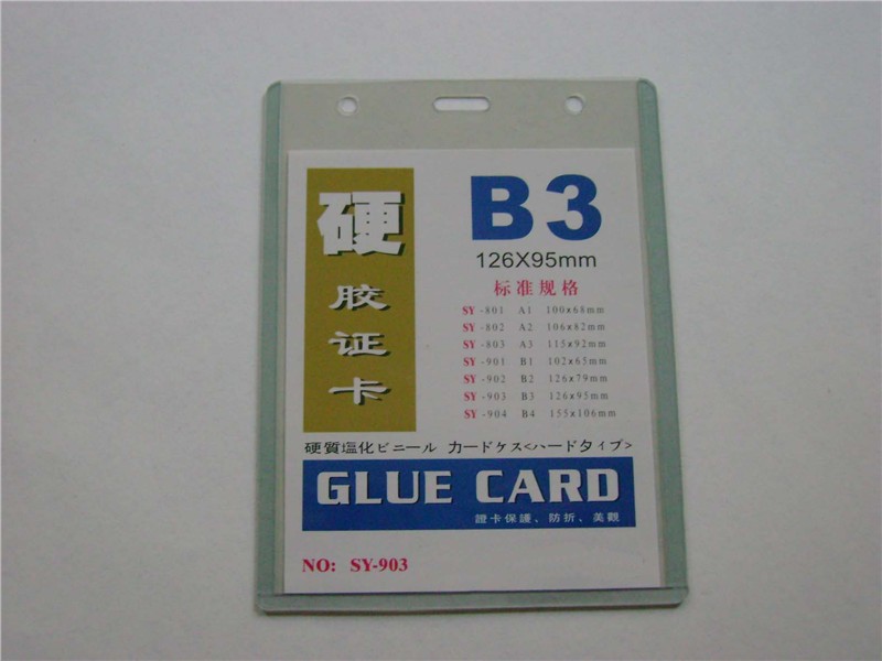 证件卡套两面都是硬的,材料是:透明的PVC  特点:有很好的透明度;不易折,能很好地保护里面的证卡. 现有的规格:A1:  100mm*68mm  B1:  102mm*65mm  A2:  106mm*82mm  B2:  126mm*79mm  A3:  115mm*92mm B3:  126mm*95mm   B4:155mm*106mm 以上A系列是横式,B系列是竖式,特殊的规格还可以定做!