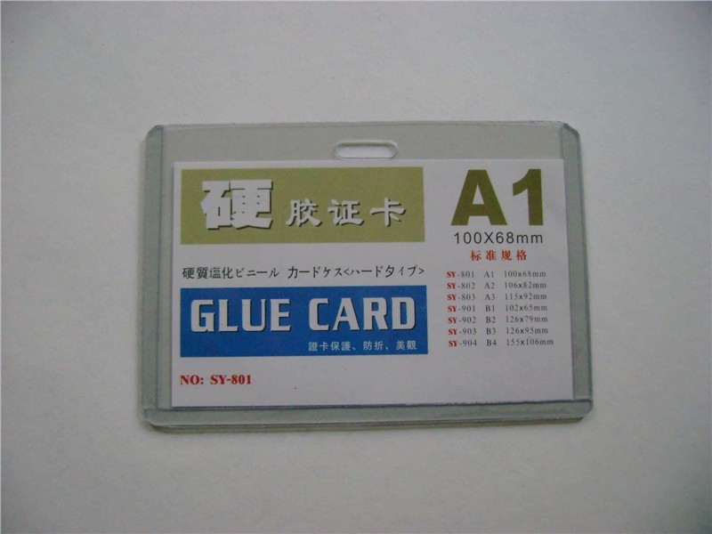 证件卡套两面都是硬的,材料是:透明的PVC 特点:有很好的透明度;不易折,能很好地保护里面的证卡. 现有的规格:A1: 100mm*68mm B1: 102mm*65mm A2: 106mm*82mm B2: 126mm*79mm A3: 115mm*92mm B3: 126mm*95mm B4:155mm*106mm 以上A系列是横式,B系列是竖式,特殊的规格还可以定做!