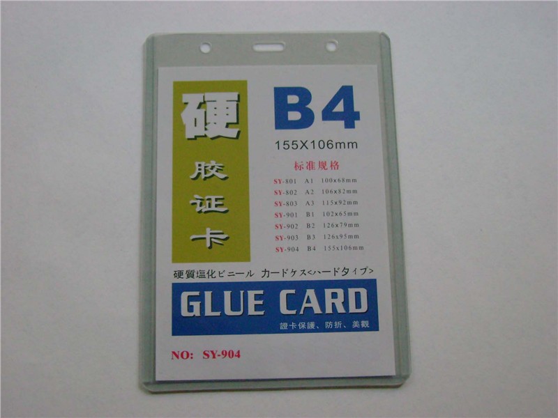 证件卡套两面都是硬的,材料是:透明的PVC 特点:有很好的透明度;不易折,能很好地保护里面的证卡. 现有的规格:A1: 100mm*68mm B1: 102mm*65mm A2: 106mm*82mm B2: 126mm*79mm A3: 115mm*92mm B3: 126mm*95mm B4:155mm*106mm 以上A系列是横式,B系列是竖式,特殊的规格还可以定做!
