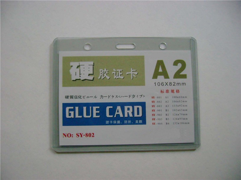 证件卡套两面都是硬的,材料是:透明的PVC  特点:有很好的透明度;不易折,能很好地保护里面的证卡. 现有的规格:A1:  100mm*68mm  B1:  102mm*65mm  A2:  106mm*82mm  B2:  126mm*79mm  A3:  115mm*92mm B3:  126mm*95mm   B4:155mm*106mm 以上A系列是横式,B系列是竖式,特殊的规格还可以定做!