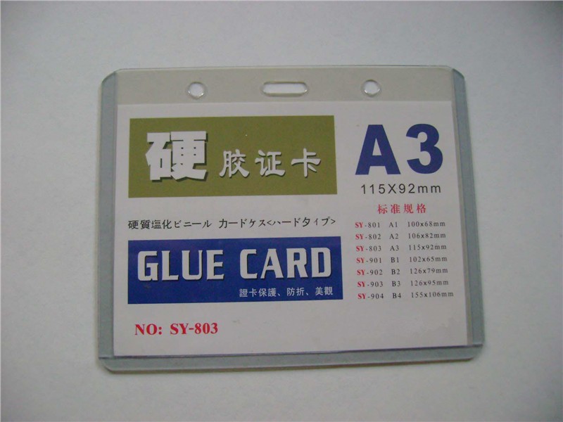证件卡套两面都是硬的,材料是:透明的PVC 特点:有很好的透明度;不易折,能很好地保护里面的证卡. 现有的规格:A1: 100mm*68mm B1: 102mm*65mm A2: 106mm*82mm B2: 126mm*79mm A3: 115mm*92mm B3: 126mm*95mm B4:155mm*106mm 以上A系列是横式,B系列是竖式,特殊的规格还可以定做!