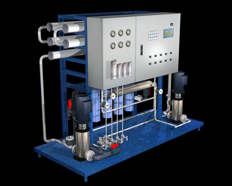 原水→原水加压泵→多介质过滤器→活性炭过滤器→软水器→精密过滤器→阳树脂过滤床→阴树脂过滤床→阴阳树脂混床→微孔过滤器→用水点