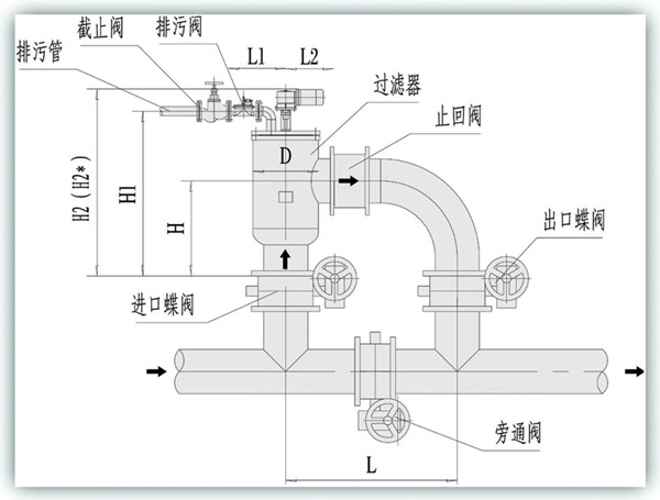 说明:1、反洗泄压排污口(DN3)由电动阀控制,并和反洗电机同步动作,即反洗电机开始启动反洗电动阀打开,开始排污,反洗结束时反洗电机停止,反洗结束;电动阀也同时关闭,排污结束。2、排污口(DN4)由手动阀控制,手动排污阀需定期开启或清洗时开启,排出沉淀到主机底部的脏物。3、均压阀及放气阀在第一次工作开始时打开排气,正常工作时均需关闭。4、安装时应特别注意进出水口方向并不得有大粒径的脏物进入主机内,详见使用说明书。