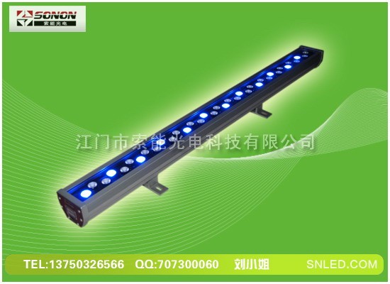 大功率LED洗墙灯是一种以大功率LED为光源,由红、绿、蓝组成混合颜色变化的投射照明灯具,可产生256灰度变化,智能控制器达到同步效果,并可接入DMX控台。用户可自己输入资料进行编程控制。该洗墙灯采用数码管地址,同时该洗墙灯内置固定程序,可实现同步、自联功能。该洗墙灯密封可靠,可调节投光角度、位置,使之处于最佳位置,达到最满意的照明效果。