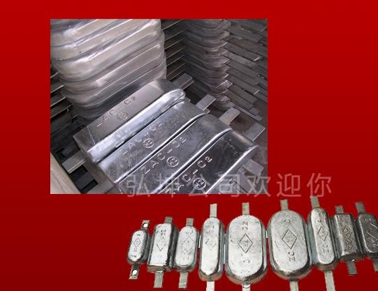 锌合金牺牲阳极用途:适用于海水、淡海水介质中的船舶、压载水舱、机械设备、海洋工程和海港设施、钻井平台、港口码头、海水介质的冷凝器、水泵以及低电阻率土壤中的管道、电缆等设施金属防腐蚀的阴极保护。