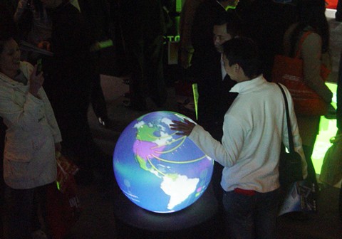 互动投影球是一个多用户、多点触摸的球形屏幕设备,利用多触点技术和操作界面相互作用的概念,可以实现观众与屏幕球之间360度全方位丰富多彩的互动, 如图像和视频文件在屏幕球上的拖动,缩放,旋转等,给观众带来全新有趣的互动体验。