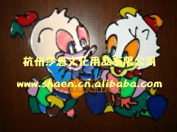 彩绘贴画,又称胶画或烤画,是一种的深受少儿喜爱的手工制作产品。将彩色颜料填入带有边框的图案中,经低温加热,就可得到制作成品,整个制作过程不超过30分钟即可完成,它能任意张贴在光滑物表面,丰富孩子们的个性空间。