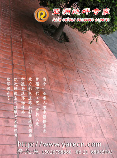 亚睿中国所施工工程遍布祖国大江南北,我公司本着广交朋友,薄利多销、质优价廉的原则,真诚与各工业地坪施工商、园林绿化工程的同仁携手共进,共同创造美好生活。 上述彩色混凝土系列产品,本公司将提供市场最优惠的价格。详情请来人来电来函联系,亚睿中国官方网站: www.yarecn.com,联系人:柴先生 15026798868,021-68935093。亚睿中国真诚欢迎您的光临指导,共创合作双赢!
