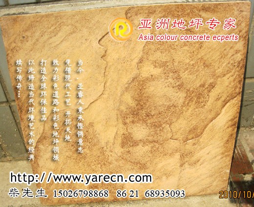 亚睿中国公司生产多种地坪材料,欢迎新老客户洽谈。 睿龙地坪材料涵盖:压模地坪材料、压印地坪材料、彩色混凝土地坪材料、透水混凝土地坪专用染色材料、彩色水泥地坪材料、彩色路面上色铺装材料、仿古地坪材料、艺术地坪材料。
