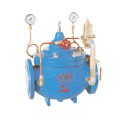 200X减压稳压阀:可根据现场需要设定阀后压力,同时阀后压力不会因为阀前压力变化而变化,也不会因为阀后流量变化而改变阀后压力,当阀后压力低于设定值时,导阀立即释放主阀控制室压力,使阀瓣做适度的开启,当阀后压力达到设定值时,主阀控制室压力增加,使阀瓣开度变小直到关闭。