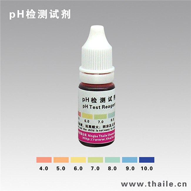 产品背景:多年来人们对酸碱度的测定方法一般有两种:一种是用pH试纸,另一种是用pH检测仪。前者检测精度低,误差较大,测试结果不准确,特别是无法检测非常弱的缓冲溶液或浓度过低的酸碱溶液;后者虽准确率较高,但仪器较贵,操作繁琐,条件苛刻,检验不方便。宁波泰来化工科技有限公司的科研人员经深入研究,成功研制出了“Thaile”牌pH检测试剂。本试剂克服了上述两种传统的酸碱度检测方法的缺点,极大地简化了操作,降低了检测成本,效果显著,数据可靠。