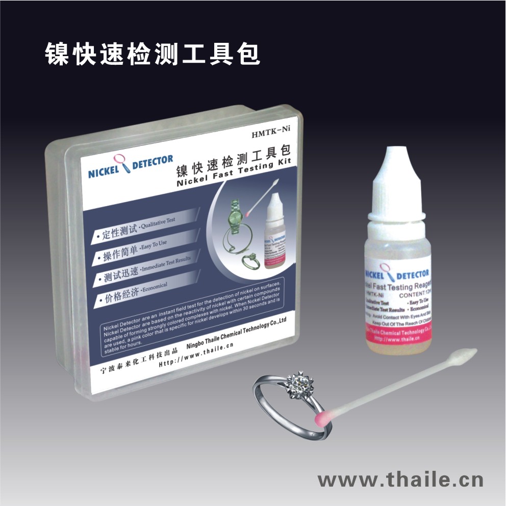 镍已经被认定为是潜在的刺激性金属,可使过敏的人患皮肤炎。如果接触到皮肤,能刺激人体免疫应答而起疹子,有时可能导致更严重的免疫反应。如果吸收了可溶解的镍盐,会产生恶心、呕吐、腹泻等不适症状。欧盟、美国、日本等国家都对与人体皮肤长期接触的制品和刺穿耳朵或身体其它部位的制品中镍元素含量和释放量做出了规定。常规的检测方法是将样品送到实验室检测,时间长,费用高,操作麻烦,对样品有破坏,覆盖面小,只能抽样检测,针对以上情况,我公司与ITS CHEMICAL,INC.合作于2006年开发出NICKEL DETECTOR镍快速检测试剂,能够对镍离子进行快速的筛选性检测。