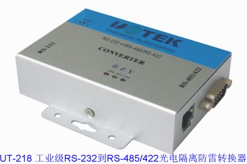 UT-218光电隔离型接口转换器、兼容RS-232C、RS-422、RS-485标准,能够将单端的RS-232信号转换为平衡差分的RS-422或RS-485信号,内置的光电隔离器,能够提供高达2500Vrms的隔离电压,带有快速的瞬态电压抑制保护器及放电管,此保护器被设计用来保护RS-422/RS-485接口,采用当今先进的TVS(TRANSIENT VOLTAGE SUPPRESSOR)瞬态电压抑制器及放电管,正常情况下TVS管及放电管呈高阻状态,当TVS管及放电管两端经受瞬间的高能量冲击时,它能以极高的速度将其两端的阻抗降低,吸收一个大电流,从而把其两端的电压钳制在一个预定的数值上,保护后面的电路元件不因瞬态高压冲击而损坏。此保护器可以有效地抑制闪电(LIGHTNING)和ESD,提供每线1500W的雷击浪涌保护功率,以及各种原因在线路上产生的浪涌电压和瞬态过压,并且极小的极间电容保证了RS-422/RS-485接口的高速传输。 RS-232接口端通过一个DB9母头的连接器与兼容RS-232C标准接口相连,RS-422、RS-485端通过RJ-45及DB9公头的连接器连接。转换器内部带有零延时自动收发转换,独有的I/O电路自动控制数据流方向,而不需任何握手信号(如RTS、DTR等),无需跳线设置实现全双工(RS-422) 、半双 工(RS-485)模式转换,即插即用。确保适合一切现有的通信软件和接口硬件,不需要对以前的基于RS-232的工作方式作任何软件的修改。