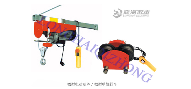 微型电动葫芦是龙海起重电动葫芦的一种,微型电动葫芦需要通过工字钢安装,微型电动葫芦的起升速度为10m/分钟,起升高度可加长到30米。微型电动葫芦的电机功率根据型号的不同也略有差别。微型电动葫芦的最小载重为200kg,最大载重为1000kg,标准绳长12m,可单绳使用,也可双绳使用,双绳起重量为单绳的两倍,但起升速度和起升高度都减半。如果对龙海起重的微型电动葫芦感兴趣请致电林红娜,龙海起重还有环链电动葫芦,手拉葫芦,超低型环链电动葫芦等,您!