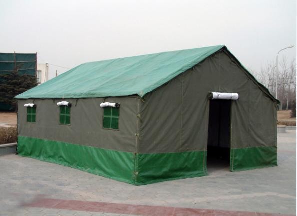 (5) 帐篷大顶面料为军绿色三防布,山墙、围墙面料为军绿牛帆布(冬暖夏凉),中间使用毛毡,内衬白布,做工以军品帐篷为标准。窗户设有纱网,具有防蚊虫、通风等功能