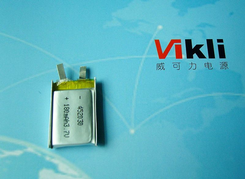 1、电池尺寸为厚度4.5mm、长度20mm、高度30mm,容量180MAH,内阻小、重量轻、性能稳定、容量足、循环寿命长等诸多优良性能。