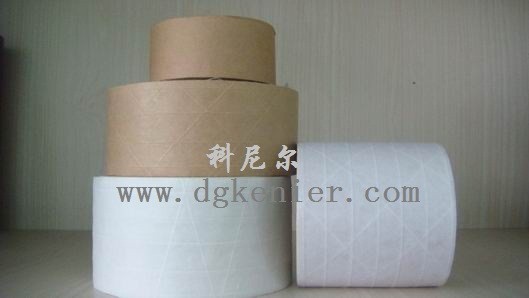 以牛皮纸为基材,涂覆橡胶/热熔型胶粘剂制作而成的压敏胶粘带。具有使用方便,容易撕断,具有高度粘接性,故广泛用于轻重包装封箱纸加工业接驳使用及环保要求较高的封口包装等。储存及使用环境:颜色:有黄色、白色。(有湿水夹筋、夹筋自粘白色牛皮纸 封箱牛皮纸胶带);特性:绿色环保产品,双(单)层白牛皮纸覆加强纤维网格线,涂布水性胶后用于代替压敏型胶粘带。