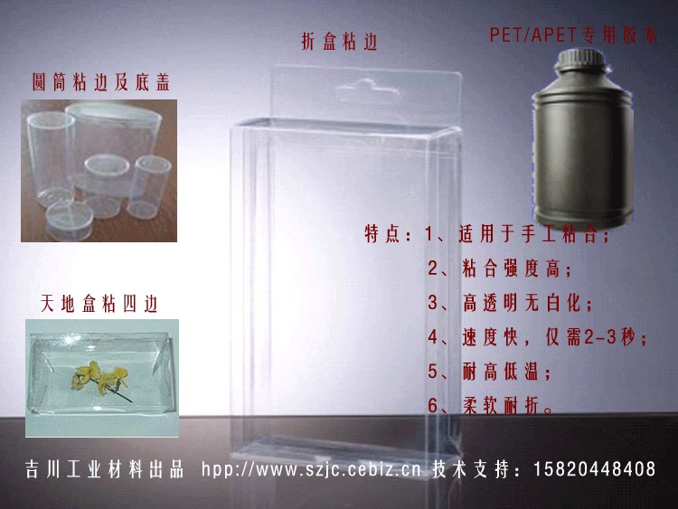 主要是PET或APET片材间高透明粘合,具有UV光照固化速度快、高透明无白化、柔软耐折、强度高等,是目前手工操作最理想的产品,而且效率高。
