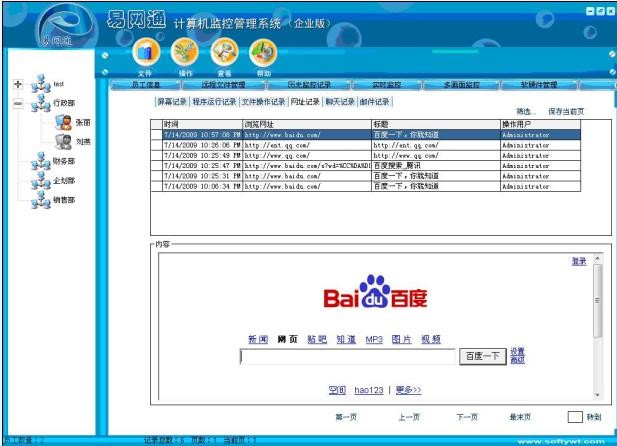 易网通监控软件可以监控到被监控者从开机以后的一切操作-----上网监控,聊天监控,屏幕监控,邮件监控,文件复制拷贝监控,插入U盘监控,网址过滤,端口封堵等等,以及对文件的操作记录,拷贝带走了什么文件都可以了如指掌,另外,还支持多达16画面的多画面实时监控,甚至支持实时的远程控制。