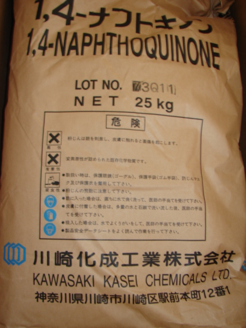 1,4-萘醌,分子式:C10H6O2, CAS号:130-15-4,外观: 黄色晶体, 含量%:≥98;用途:用于制染料、药物、杀菌剂,也用作合成橡胶和树脂的聚合调节剂;包装:50公斤/箱