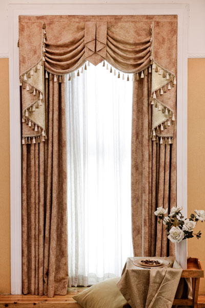 供应腾川布老虎窗帘之秋色风华:秋天收获的色调给人心情的拾穗,带来圆满的丰收,金丝线的点缀让它在经历风华的岁月痕迹上不减高贵气质,咖啡色的渲染,不致刻板,不致中庸,加上荡渡眉、流苏的装饰,宛如殿堂里脱俗的贵人。