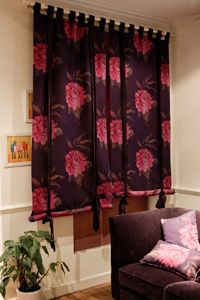 此款窗帘最大的特色就是运用了大朵的牡丹作为主图案,牡丹作为中国的国花,有着吉祥富贵的含义。用色如题,用了紫底红花,大有一片嫣红姹紫的景象,更有寓意万事繁荣兴旺,