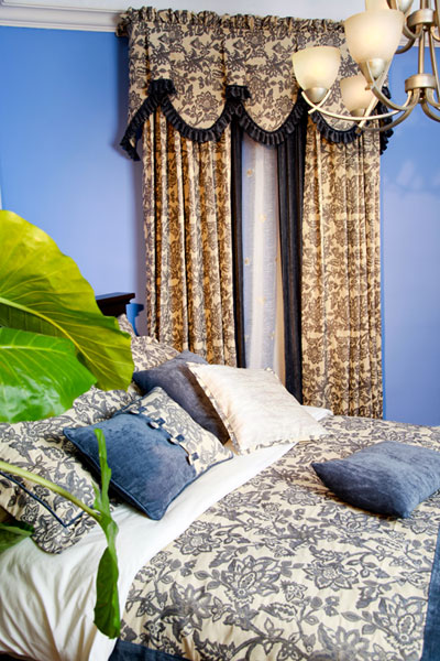花花相拥,繁复交错。蓝色与米色经典搭配给人安静的感觉。楣头的深蓝色拼布与主布面料的花色相呼应,增加了整款窗帘的层次感。