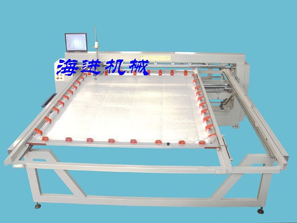 绗缝机,所有图案和程序均存储在3.5″电子盘上。电脑以中英文方式显示预置参数、绗缝图案和工作状态。操作者可按屏幕提示,选择所需要的工作参数,如针迹长度、针速等。绗缝时,屏幕作实时动态跟踪和图案变色显示。发生断上线,机头自动移到机架边缘。穿好线后,机头能复位到断线处并沿原路线倒退数针,然后继续绗缝。