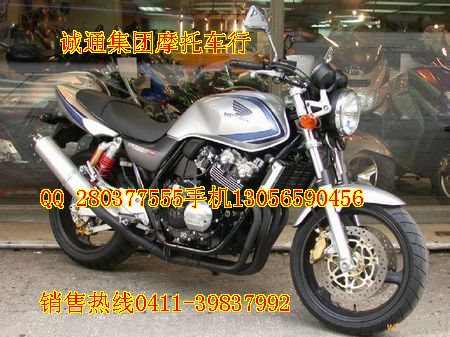 大连诚通集团摩托车行出售摩托车本田CB400SF价格4000元   引擎形式 四冲水冷DOHC16活瓣并列四汽缸缸径 x 冲程55.0 mm x 42.0 mm压缩比 11.3 : 1总排气量399 cc最高马力53ps / 11,000rpm最大扭力3.9 kg-m / 9,500rpm车架形式 高拉力钢摇篮车架传动系统 湿式多片6前速链传动燃油供应 化油器 前倾角( R) 25.5 °  (25.15) 拖曳距(T)90 mm (89mm)前悬挂系统 41mm套管油压前叉 后悬挂系统 双筒油压避震 轮胎(前)