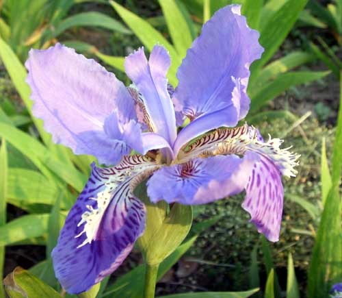 紫花鸢尾(别名山马蔺)分布于中国东北、华北、西北、西南等地;中亚、西伯利亚、远东也有。细茎鸢尾属根茎疏丛型草,分蘖力强,常形成草丛。多年生草本,根状茎细长,棕褐色,密生条状须根。植株基部有褐色宿存纤维状的枯死叶鞘。