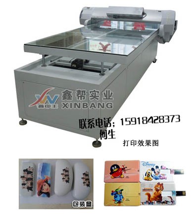 深圳市鑫帮实业彩色印刷设备有限公司所生产的万能数码平板彩色打印机,采用特制墨水,让您的加工更方便,无需出菲林制版套色免中间耗材,可直接喷印玻璃,水晶,布料光盘,类,金属,皮革,玻璃,亚克力,硅胶,塑胶,橡胶,PVC,ABS,瓷砖,陶瓷,木板,金属制品,塑胶制品,硅胶,PVC等什么材料都可以,成本比传统印刷低80%,成品可以防水,附着力强,顔色艳丽,效果逼真,无色差,无混色废品;渐变色/层次明显,工人无需经验基础;一次即可呈现完美的图案,无需要起印量,可协助用户拓展新业务,大幅度提升工作效益,例如:礼品经营店、影楼、工艺品厂、标牌制作、旅游点个性纪念品制作。并可降低生产成本,人工智能双向可选择打印方式,八色打印效果完美过度;连续供墨方式;20厘米高度调节平台,满足不同客户的需求! 在全彩印刷领域脱颖而出!适用打印材质塑料(ABS、PC、PE、PP、PU、PVC等)、亚克力、金属、木制品、皮革、纺织布料、玻璃、水晶、铜版纸、瓷砖/瓷器……适用打印产品U盘、MP3/MP4、移动硬盘、手机、笔记本电脑、光盘、礼品、玩具、文具、家私、瓷器  欢迎来电咨询。电话15918428373  QQ1193241499 何先生