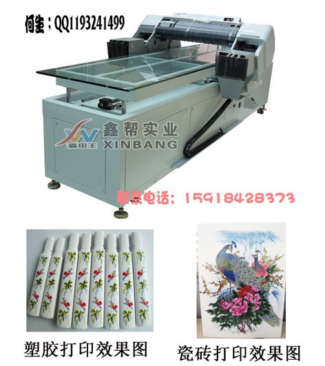 深圳市鑫帮实业彩色印刷设备有限公司所生产的万能数码平板彩色打印机,采用特制墨水,让您的加工更方便,无需出菲林制版套色免中间耗材,可直接喷印玻璃,水晶,布料光盘,类,金属,皮革,玻璃,亚克力,硅胶,塑胶,橡胶,PVC,ABS,瓷砖,陶瓷,木板,金属制品,塑胶制品,硅胶,PVC等什么材料都可以,成本比传统印刷低80%,成品可以防水,附着力强,顔色艳丽,效果逼真,无色差,无混色废品;渐变色/层次明显,工人无需经验基础;一次即可呈现完美的图案,无需要起印量,可协助用户拓展新业务,大幅度提升工作效益,例如:礼品经营店、影楼、工艺品厂、标牌制作、旅游点个性纪念品制作。并可降低生产成本,人工智能双向可选择打印方式,八色打印效果完美过度;连续供墨方式;20厘米高度调节平台,满足不同客户的需求! 在全彩印刷领域脱颖而出!适用打印材质塑料(ABS、PC、PE、PP、PU、PVC等)、亚克力、金属、木制品、皮革、纺织布料、玻璃、水晶、铜版纸、瓷砖/瓷器……适用打印产品U盘、MP3/MP4、移动硬盘、手机、笔记本电脑、光盘、礼品、玩具、文具、家私、瓷器  欢迎来电咨询。电话15918428373  QQ1193241499 何先生