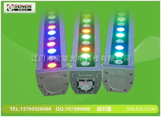 大功率LED洗墙灯是一种以大功率LED为光源,由红、绿、蓝组成混合颜色变化的投射照明灯具,可产生256灰度变化,智能控制器达到同步效果,并可接入DMX控台。用户可自己输入资料进行编程控制。该洗墙灯采用数码管地址,同时该洗墙灯内置固定程序,可实现同步、自联功能。该洗墙灯密封可靠,可调节投光角度、位置,使之处于最佳位置,达到最满意的照明效果。(缔造绿色低碳生活,选用索能LED灯饰)