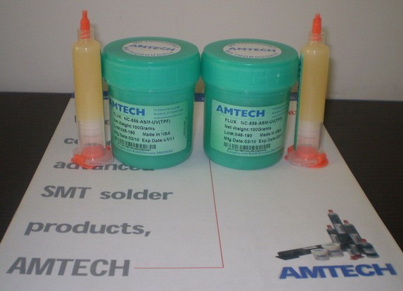美国AMTECH研发了两种使用于手机PCB,BGA及PGA等SMD之返修助焊膏,它使用于低离子性之活化剂系统,润锡速度快,冒烟程度很低,残留物固化后之表面绝缘阻抗值很高,因此,对手机等通讯产品之电性干扰非常小.三.产品性能:1.RMA-223-UV为中度活性之松香型助焊膏,广泛使用手机板之SMD返修工艺. 2.NC-559-ASM为免洗型助焊膏,残留物颜色非常淡,有极高之SIR值,建议用于BGA、CSP等球阵焊点返修及补球.四.包装方式:100克/瓶及10ml/支