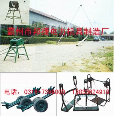 本厂生产:水泥杆运杆车,铝合金人字抱杆,铝合金立杆机,机动绞磨,放线滑车,脚扣,安全带,电缆拖车,电缆放线架。