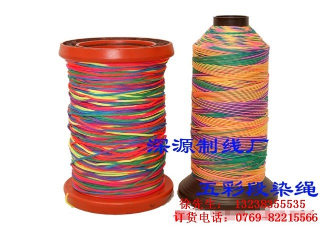 东莞市深源线业有限公司开发生产的(五彩线、带、绳)、七彩、又名多彩、段染线。材料有锦纶、绦纶、长纤与短纤2种,由特殊的段染色设备,段染而成。其特点是颜色鲜艳,润滑度好产品主要用于高档的箱包、服装、鞋帽、制衣、工艺礼品等制品的缝纫上,装饰效果显著,据说:用五彩线织鱼网可以吸引鱼群。颜色和规格可按客人要求生产。
