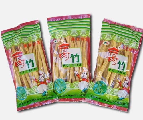 :豆浆用蒸汽蒸后,放入特制的磨具中(大小可调),熟豆浆冷却后凝结的薄皮为油皮,油皮在鲜软时捏成带状挂起为腐竹。