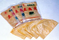 :豆浆用蒸汽蒸后,放入特制的磨具中(大小可调),熟豆浆冷却后凝结的薄皮为油皮,油皮在鲜软时捏成带状挂起为腐竹。