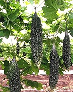 黑皮苦瓜,跟其他的苦瓜比,它的苦味不那么浓,苦味要淡一点黑皮苦瓜味道清淡,更适合生食黑皮苦瓜个大,果长约30厘米,而且每个节间都有瓜,这是它与普通苦瓜的不同之处,此外,它生长势旺,坐果能力强,产量稳定,抗病性好。从播种到商品瓜采摘约50天左右。 黑皮苦瓜营养丰富,所含蛋白质、脂肪、碳水化合物等在瓜类蔬菜中较高,特别是维生素C含量,每百克高达84毫克,约为冬瓜的5倍,黄瓜的14倍,南瓜的21倍,居瓜类之冠。