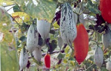 变色瓜也称彩瓜、白粉瓜,因其两头小中间大,俗称其老鼠瓜,是葫芦科栝楼属一年生攀援性草本植物,原产印度、马来西亚一带,是一种非常新奇的瓜菜,特别适宜在科技园区和院种植,观赏食用兼得。变色瓜依瓜皮条纹分青皮白条和白皮青丝二种,根系特别发达,蔓长6-8米,生长势特别旺盛,叶深绿色,两面密生茸毛,掌状,叶脉放射状。雌雄同株异花,因此结瓜率特强,瓜形奇特,两头尖中段粗,瓜皮以白绿为主,间有绿色细条纹,果肉白色,单瓜重200-300克,嫩瓜食用味道好,炒菜或做汤,口味清香。留种成熟的种瓜色彩红艳,经久不落,非常美丽。变色瓜产量奇高,单株可结果200-300个,种上2-3株全家食之不尽,结果期长达4-5个月。变色瓜适应性强,对光照要求不严,耐高温,耐干旱,我国南北均可种植,每年2-6月均可播种,对土壤适应性很广,但以排水良好的沙壤土或粘壤土为宜。需搭高架棚种植,亩栽300株,亩产万斤以上,可自己留种。