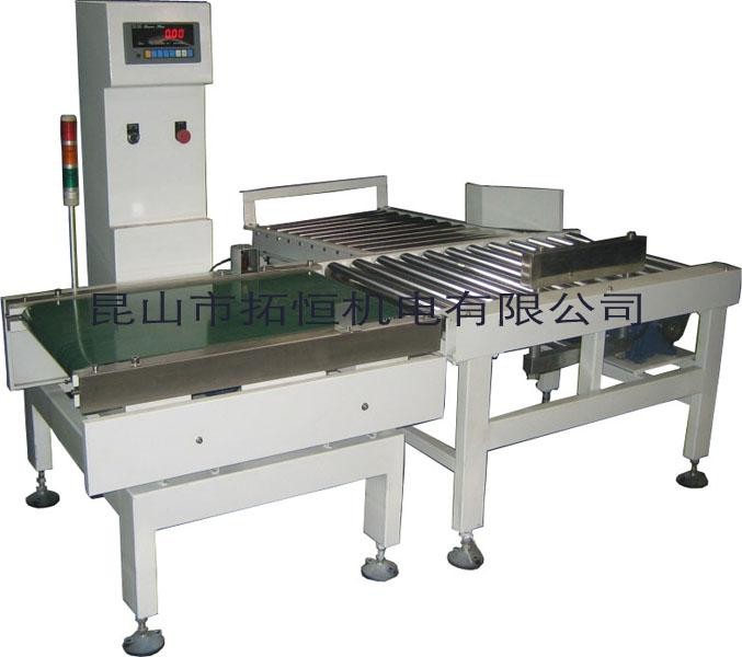 重量自动检测秤是依高速动态重量读取方式对成品物进行称重检测。系统根据设定的目标重量值,自动检测出产品的重量是否合格、包装箱内产品的数量是否有缺失、说明书或配件是否漏装或多装等,发现不合格品系统将自动发出警报或根据重量自动分级,也可配合后续流水线作自动剔除不良品之连锁动作(选配)。又名:欠重检测机、重量选别秤,重量分选秤、重量选别机、重检机、自动称量机、皮带秤、检重仪、重量分选机、检重秤、动态秤。 检测物通过检重秤进行称重检测,合格的送回原有输送带,不合格的予以剔除(或报警),并且具有对产品进行自动分类和统计等功能;整个检测对包装流水线原有的工作流程没有大的改变。可节省人力、提高效率,以达到控制产品质量地目的,提升客户的满意度,是自动生产线及包装线上的最佳品检设备。