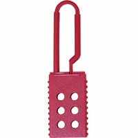 绝缘六联锁具由超强尼龙制成,不易断裂、耐高温、耐寒、柔韧性好,最多可供六人锁定单一电源。接纳钩套直径大至3/8’’的挂锁。