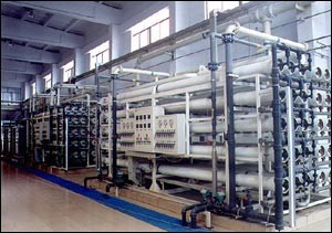 适用于纯水生产、住宅小区直饮水、生产工艺用水等对水质电导率要求小于等于10us/cm的各种用水需求,产水符合GB17323-1998饮用纯净水国家标准。 生产线由预处理系统和反渗透主机组成,预处理系统通常包括多介质过滤器、活性碳过滤器,主机由精密过滤器和反渗透装置组成。设备从0.25吨/小时至100吨/小时以上。 应用领域:纯水生产、住宅小区直饮水、生产工艺用水。纯水设备主要工艺流程: 1、原水罐 储存原水,用于沉淀水中的大泥沙颗粒及其它可沉淀物质。同时缓冲原水管中水压不稳定对水处理系统造成的冲击。(如水压过低或过高引起的压力传感的反应)。 2、原水泵 恒定系统供水压力,稳定供水量。 3、多介质过滤器 采用多次过滤层的过滤器,主要目的是去除原水中含有的泥沙、铁锈、胶体物质、悬浮物等颗粒在20um以上的物质,可选用手动阀门控制或者全自动控制器进行反冲洗、正冲洗等一系列操作。保证设备的产水质量,延长设备的使用寿命。 4、活性炭过滤器 系统采用果壳活性炭过滤器,活性炭不但可吸附电解质离子,还可进行离子交换吸附。经活性炭吸附还可使高锰酸钾耗氧量(COD)由15mg/L(O2)降至2~7mg/L(O2),此外,由于吸附作用使表面被吸附复制的浓度增加,因而还起到催化作用、去除水中的色素、异味、大量生化有机物、降低水的余氯值及农药污染物和除去水中的三卤化物(THM)以及其它的污染物。可选用手动阀门控制或者全自动控制器进行反冲洗、正冲洗等一系列操作。保证设备的产水质量,延长设备的使用寿命。同时,设备具有自我维护系统,运行费用很低。 5、离子软化系统/加药系统 R/O装置为了溶解固体形物的浓缩排放和淡水的利用,为防止浓水端特别是RO装置最后一根膜组件浓水侧出现CaCO3,MgCO3,MgSO4,CaSO4,BaSO4,SrSO4,SiSO4的浓度积大于其平衡溶解度常数而结晶析出,损坏膜原件的应有特性,在进入反渗透膜组件之前,应使用离子软化装置或投放适量的阻垢剂阻止碳酸盐,SiO2,硫酸盐的晶体析出。 6、精密过滤器 采用精密过滤器对进水中残留的悬浮物、非曲直粒物及胶体等物质去除,使RO系统等后 续设备运行更安全、更可靠。滤芯为5um熔喷滤芯、目的防止上级过滤单元,漏掉的大于5um的杂质除去。防止进入反渗透装置损坏膜的表面,从而损坏膜的脱盐性能。 7、反渗透系统 反渗透装置是用足够的压力使溶液中的溶剂(一般是水)通过反渗透膜(或称半透膜)而分离出来,因为这个过程和自然渗透的方向相反,因此称为反渗透。 反渗透法能适应各类含盐量的原水,尤其是在高含盐量的水处理工程中,能获得很好的技术经济效益。反渗透法的脱盐率提高,回收率高,运行稳定,占地面积小,操作简便,反渗透设备在除盐的同时,也将大部分细菌、胶体及大分子量的有机物去除。 8、臭氧杀菌器 杀灭由二次污染产生的细菌彻底保证成品水的卫生指标。