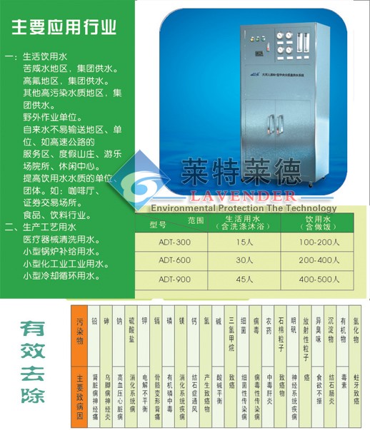 应用:任何一种江、河、湖、沼泽、海洋等水源均可处理成优质净水使用;海岛地区、沿海缺水地区、船 舶、油田等生产生活用水。