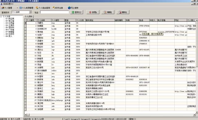 名片本身是联系信息,各种各样的联系信息毫无疑问是您非常宝贵的无形资产。 维特小巧名片王主要是为了管理您长期积累下来的众多名片而设计,当然也可以用来管理您的其他联系信息。 维特小巧名片王能记录大量的人员信息(包括:姓名.职务.公司.地址.电话.传真.手机.Email.QQ.邮编),并分类管理,自定义分类,群发邮件,群发短信,直接发送qq消息,导出excel,从excel导入客户信息,供您方便的浏览.查询.为您的生活带来方便。