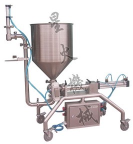 该机为半自动活塞式灌装机,可灌装颗粒浆状流体物料。