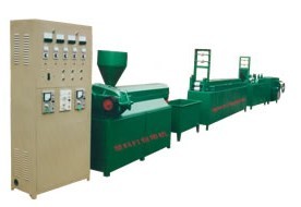 河南省华兴机械制造有限公司生产的SJ-65、70型塑料打包带机组http://www.hnhxgs.com 是生产打包带的成套设备,其原料为聚丙烯。主要设备由电器控制柜-挤出机-水箱-前牵引-加热床-水箱-拉伸卷取成型等部分组成,成品规格为15±0.5×1±0.2mm,动力为4.4-11Kw,产量为25-50公斤/小时。