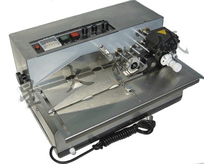 原理及特点: 固体墨轮打码机是一种先进的接触式热打码机。本机采用间歇式自动加热和精密的机械相结合,可根据用户需要,任意选择打码内容与打码位置,并可设定打码张数,打码速度快,性能可靠,字迹清晰,打码动作及计数采用光电开关控制。