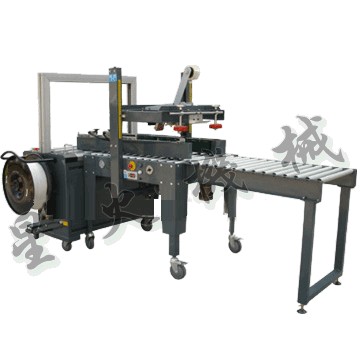 本系统由自动封箱机,全自动捆扎机和输送架组成,具有连续自动封箱及多道捆扎包装的功能,既减少占地面积,又降低包装成本。采用德国西门子公司LOGO!进行自动控制,工作可靠。操作方便,保养简单。封箱、捆扎机也可分别单独使用。